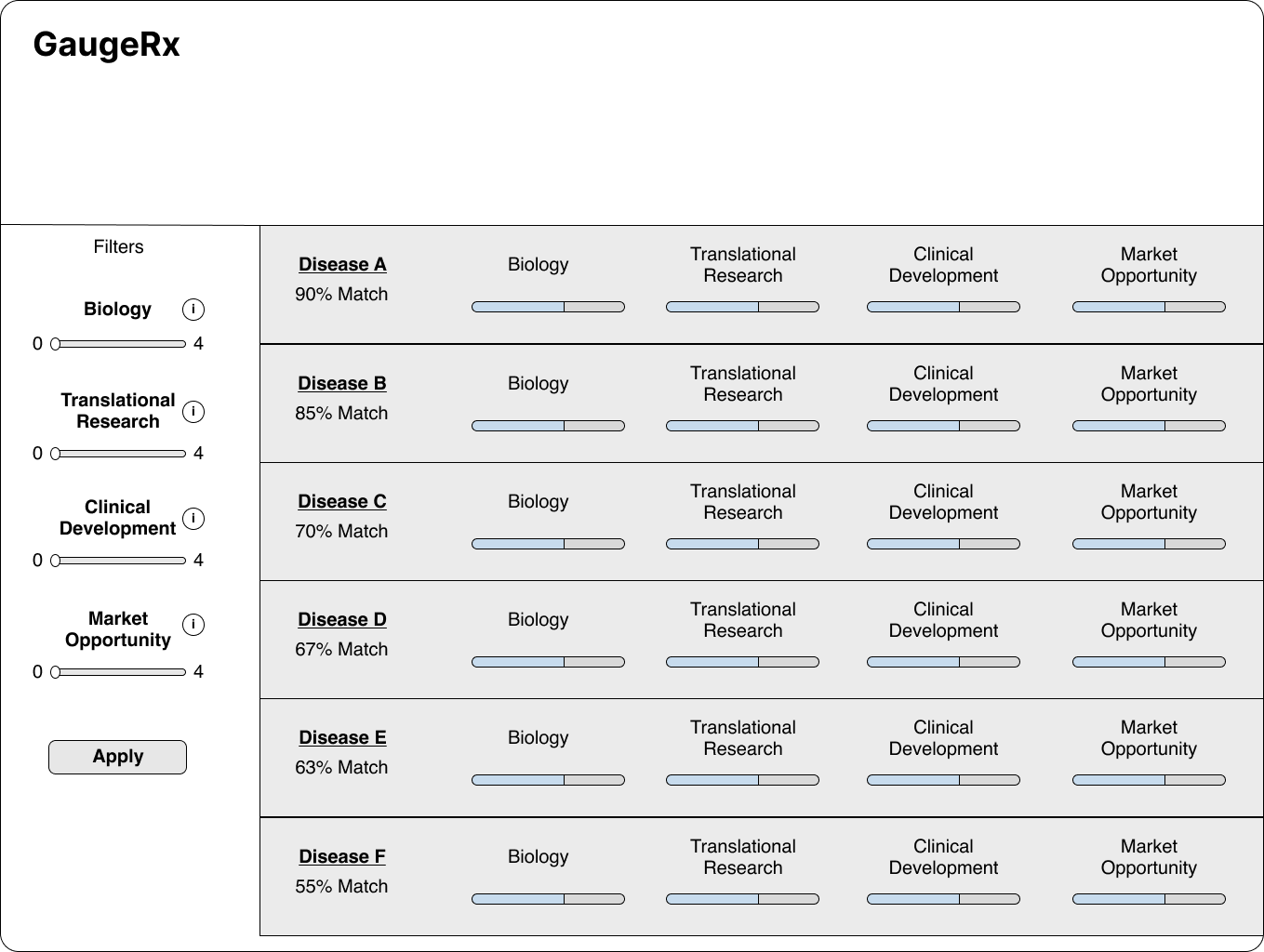 Our tool, called GaugeRx, will display relevant data on all available diseases to allow researchers and advocacy groups to better understand the readiness of a specific disease and its community to accelerate drug development. Scroll below to see key features and to the bottom to see the final prototype.