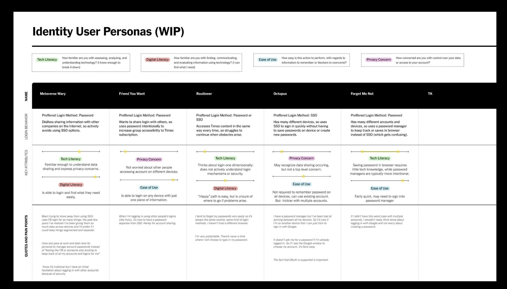After hearing about the many ways people deal with login security (writing down all passwords on paper, using a password manager), I created an initial draft of user personas to push design understanding forward for my engineering team.
